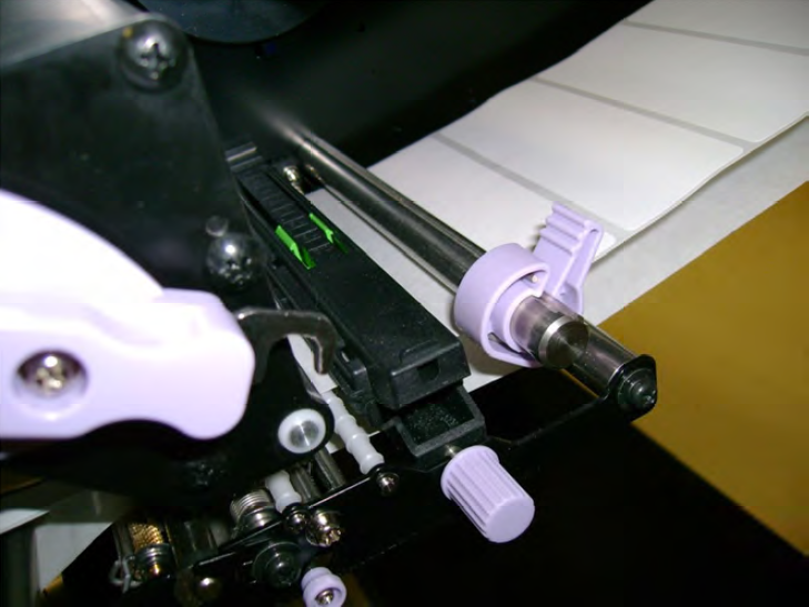 | 1. Open the printer cover. 2. Use the light purple knob on the end of the black bar to adjust the location of the "eyes" in relation to the label roll. Align the "eyes" with the middle of the label roll. Note: If the "eyes" are set at the edge of the label roll, they may have trouble telling the difference between the edge of the label and the gap between the labels. | |